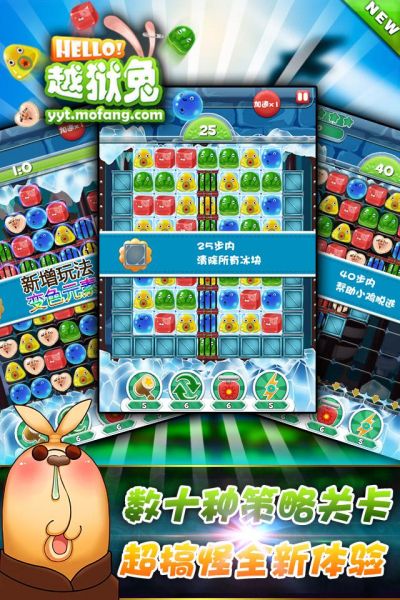 《Hello!越狱兔》共有300关。玩家按照闯关制逐步解开新的游戏关卡,带领兔子一步一步走向幸福!统三消游戏中玩家获得成就感的唯一指标就是赢高分。但在《Hello!越狱兔》中,除了部分关卡设置了时间限制外,你还需要配合剧情去接受消除冰块、解救兔子和狱警玩躲猫猫等更多的挑战。让玩家感受到游戏中挑战的乐趣。