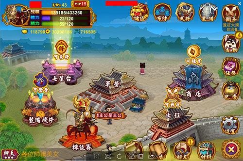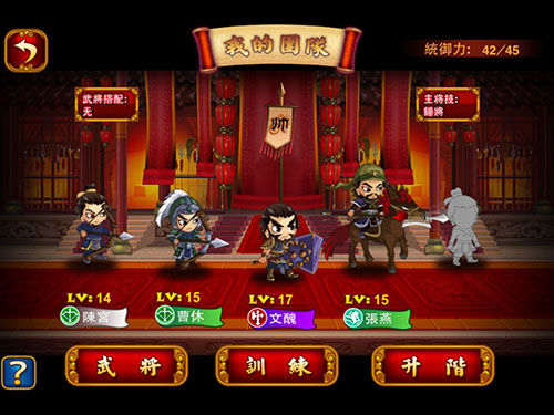 【军营】:显示我的武将团队,在此可以训练强化武将、武将品级升阶、出售武将。