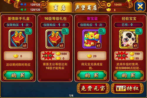 军营【商店】:商店中可使用元宝及声望购买各种强力道具。