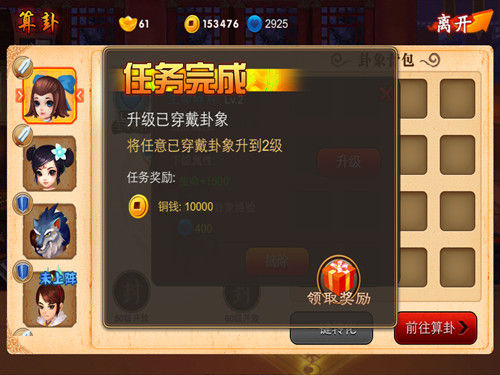 根据卦象推算吉凶,是古时的一种信仰。中国古代复杂玄妙的哲学巨著《易经》有曰:“君子慎始,差若毫厘,谬以千里。”简而言之,说的是细小的改变也会对未来有很大影响。《囧西游》也将算卦系统引进游戏中,从普通的江湖术士到赫赫有名的“正一真人”张天师,玩家可选择方便快捷的“一键算卦”,而后装备卦象。还可对卦象进行升级,即可提升角色的属性。轻轻几点,确实能带来无限变化。