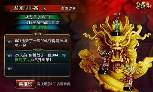完成70级主线任务后,每个服务器竞技场前100名玩家皆可参加跨服英雄榜挑战。当日统计英雄总排名,在英雄榜单前100名的玩家可继续参加第二天的挑战。英雄榜奖励是龙纹令与真元丹,可打通各路经脉、大幅提高属性实力,是一次使用终生享受的好奖品,前100名皆能领取!新服玩家无需担心与老服玩家的战斗力差距,系统默认每4-5个服为一个赛区,以赛区为单位安排战斗与统计总分。