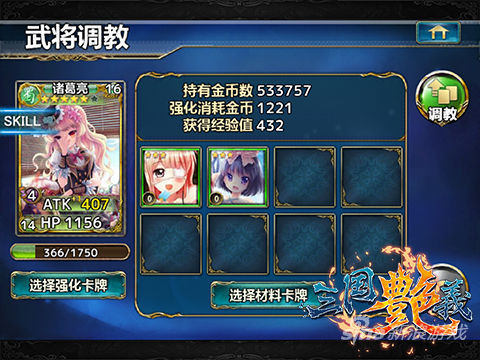 《三国艳义》中各萌娘的育成是一个极具趣味性的过程,玩家既可以通过初始卡牌逐步升级,慢慢的品味调教萌娘武将从萝莉成长为御姐的过程。也可以通过萌娘间相互合体的过程,将自己心仪的萌娘一步步向着卡牌培育调教,同势力间萌娘们合体还能获得更多的经验值,升级更快更轻松。