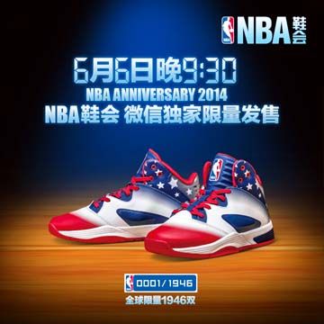 NBA总决赛今日开打,NBA首双自有品牌球鞋,全球限量1946双的NBA Anniversary 2014球鞋也将于今晚登陆“NBA鞋会”官方微信,今晚21:30,正式开抢!对于所有《NBA梦之队》玩家来说,还有额外福利,参与天梯挑战赛,每个区服都将会产生一个幸运儿获得一双NBA限量版球鞋。