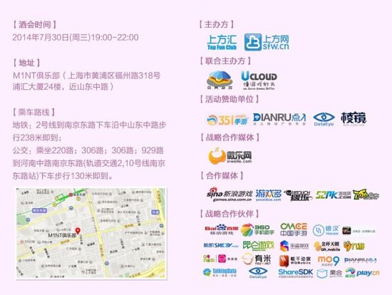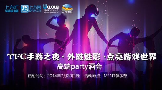 由上方汇,上方网主办,Ucloud游戏云,贝壳游戏,联合主办, 35i游戏,点入广告,棱镜,DataEye,微乐网赞助支持的TFC手游之夜高端酒会,7月30日邀请移动游戏行业的同行朋友一起在音乐、美酒之中,畅聊移动游戏,欣赏外滩美景,点亮游戏世界!