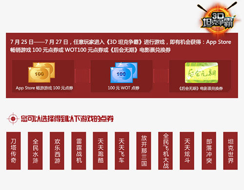 7月25日至27日,玩家登陆游戏,研发出二级坦克(只需半小时),就有机会获得App Store多款畅销游戏价值¥100的点券(刀塔传奇、全民水浒、欢乐西游、雷霆战机、天天酷跑、放开那三国、全民飞机大战、天天炫斗、部落冲突、天天飞车 )、价值¥100的WOT点券和韩寒电影《后会无期》电影观影券等价值超百万元的豪华大礼。我们将连续3天,每天抽取5000人,超高中奖率,只等你的参与。