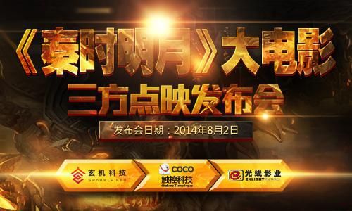 2014年8月2日晚,《秦时明月》手游大电影点映发布会将在沪隆重召开。由玄机科技(动漫方)、光线传媒(电影发行方)、触控科技(手游发行方)三界巨头联手启动。届时,国内众多资深媒体人、资深玩家都将参与其中,共同见证《秦时明月》泛娱乐战略、官方唯一授权《秦时明月》手游大电影版产品始终以及未来发展。