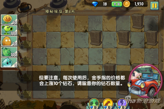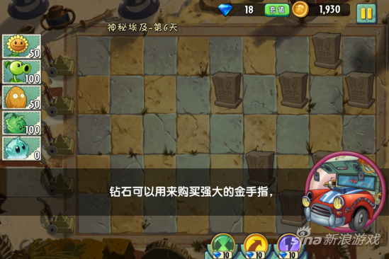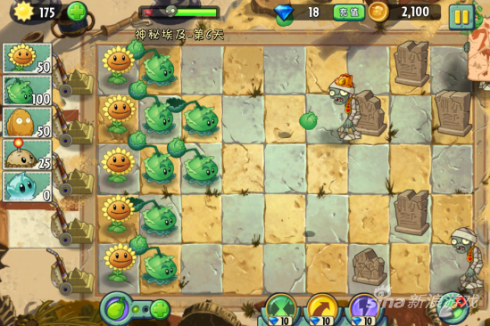 这一关中我们要选择5株植物,而总共有6株植物让你选,因此这里我们需要放弃的就是豌豆射手,因为他攻击力不算太高,而这一关又有墓碑,因此并不可取。