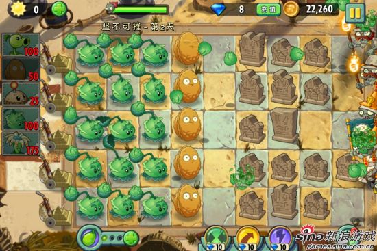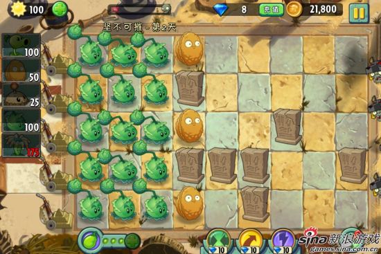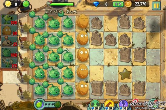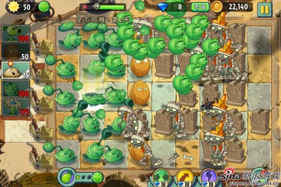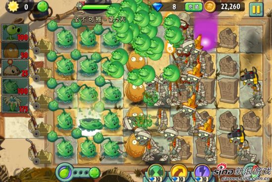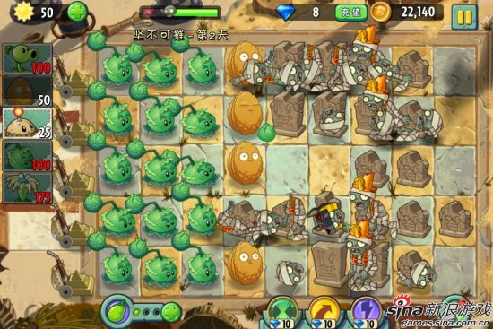 在我们通关了埃及地图坚不可摧的第一天后(点这里查看坚不可摧第一天攻略),我们便开始了植物大战僵尸2坚不可摧第二天的挑战,这一关也是增加了不少难度,如何摆阵也是非常重要的,那么这一关的植物大战僵尸2坚不可摧怎么过呢?