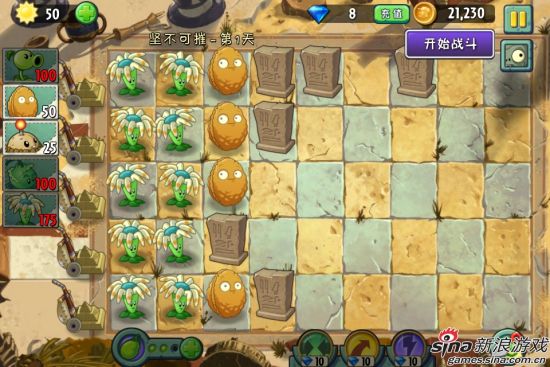 这一关中系统给了你固定的2000阳光,然后我们要先摆好植物,当摆好之后就可以点击“开始战斗”来迎接大波僵尸的袭击了(注意,坚不可摧这三关中阳光都是固定的,无法再次获取,因此大家一定要慎重选择植物)。