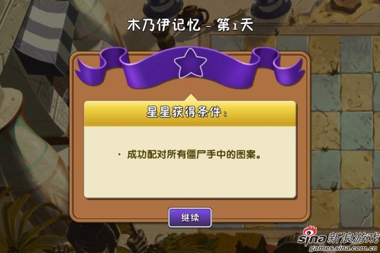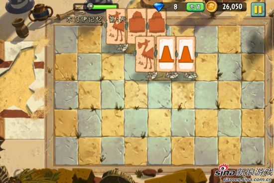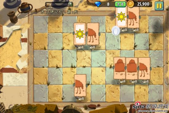 木乃伊记忆非常好(无)玩(脑),就和连连看一样,配对牌子上面的图案,配对成功就会相互消除。那么在第一天中,有路障,骷髅,帽子,阳光这四种图案,僵尸数量也不是特别多,大家可以单纯依靠记忆力来配对,不过还有一种特别简单的办法,那就是“快速消除法”,方法非常简单,双手并用不停的快速翻所有的牌子,中文版与英文版的区别就在这里:英文版是场上最多翻2张牌子,而只有牌子背过去后,才能继续翻牌子;而中文版中,每个牌子都是独立的,所以只要你的手够快,每个牌子都翻出来也是可能的,而且系统也会默认判断配对的所有牌子,这样就可以同时消除很多个僵尸了。这样看来这个关卡其实比英文版简单了很多!