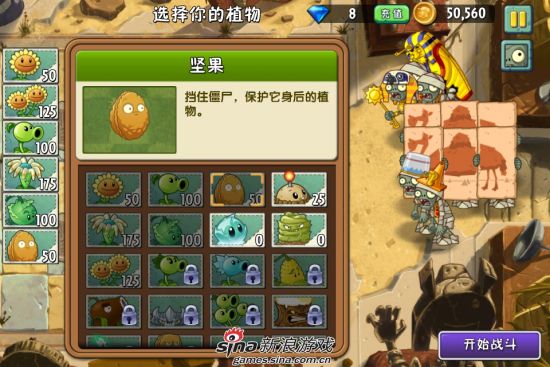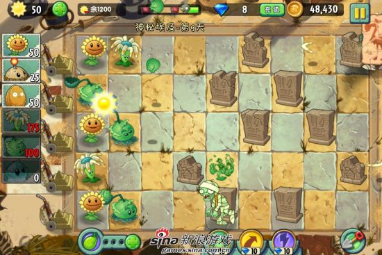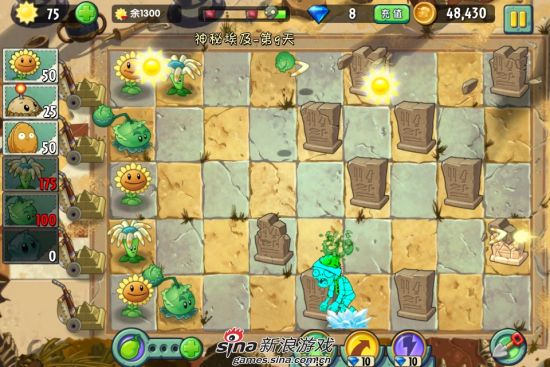 选择植物之前我们都会观察一下地形以及出现的僵尸,这关墓碑非常多,所以我们选一个噬碑藤,大BOSS也不少,其实我都有点说腻了,坑爹的宝开,不花钱内购的话,几乎就是没有选择的好嘛!!由于我们是一步一步打过来的,没有先走一遍三张地图,所以别的地图上的初级的植物我们暂时还没有获得,本着一步一个脚印的精神,所以,走完这一程我们再走下一张地图,当然,第一章地图凭借这几个植物也完全可以通关,可是我说来说去介绍来介绍去还是这几个植物!好不幸福!你们腻了么?!
