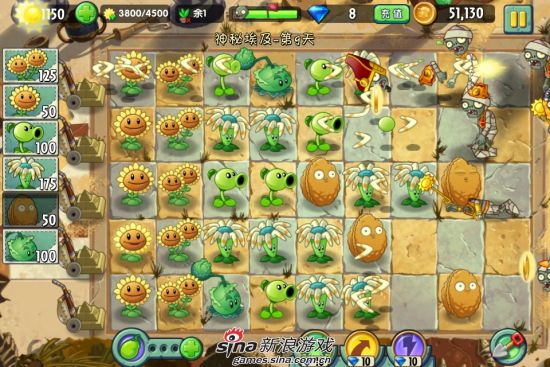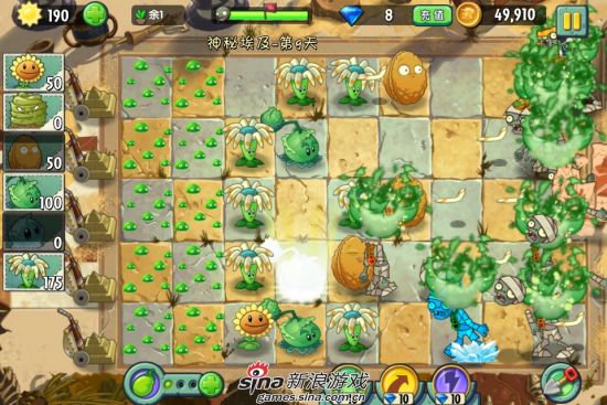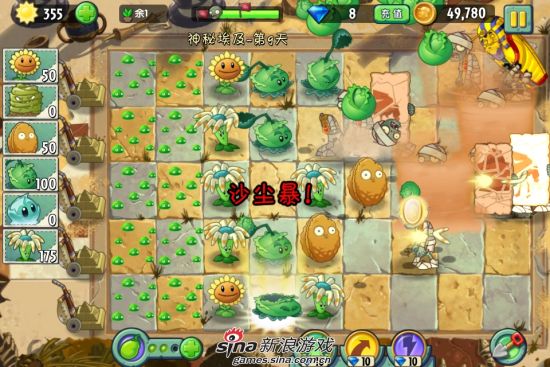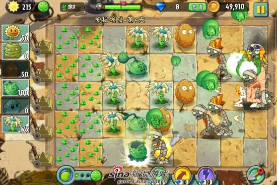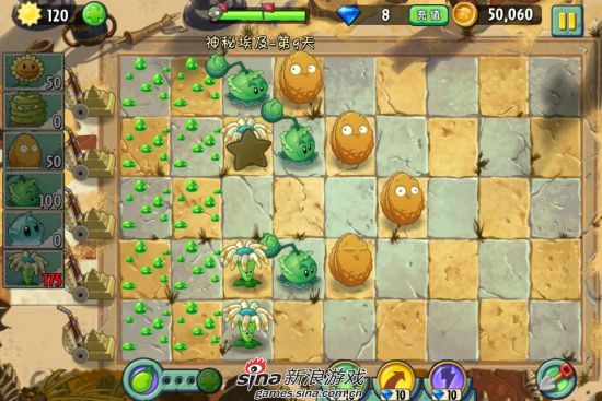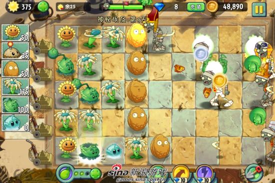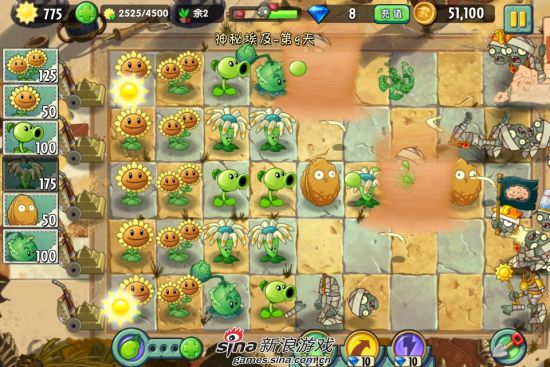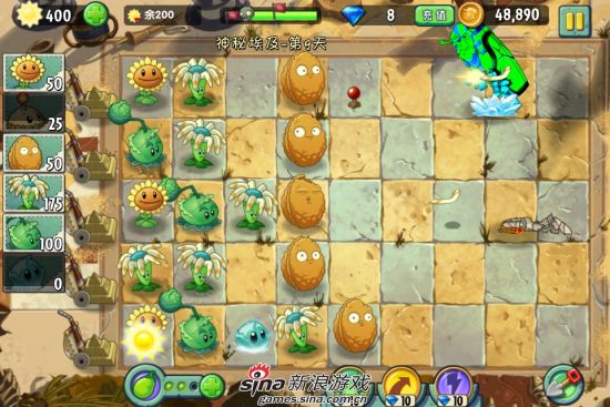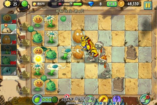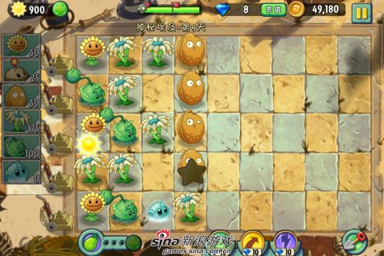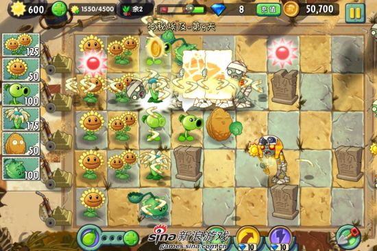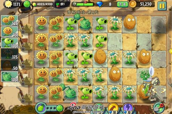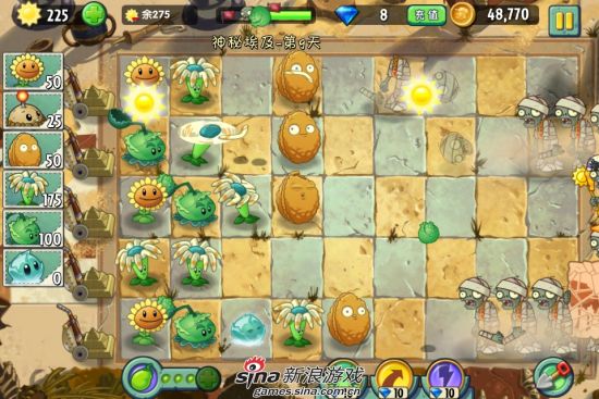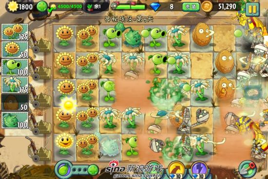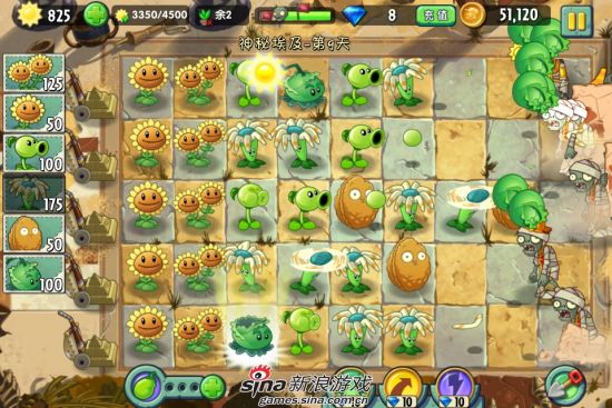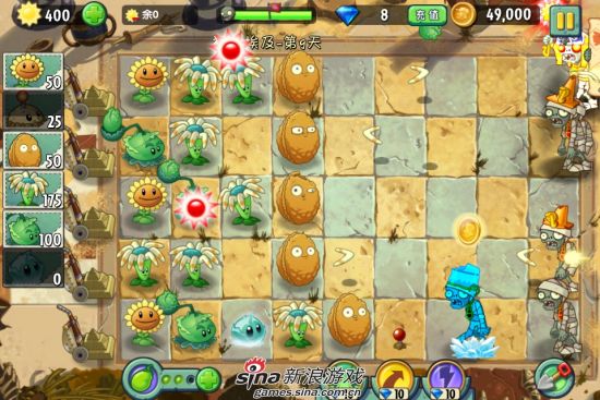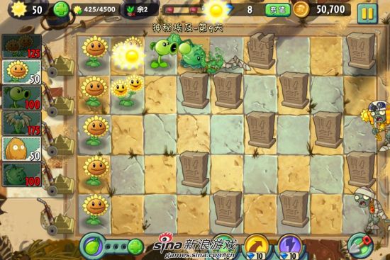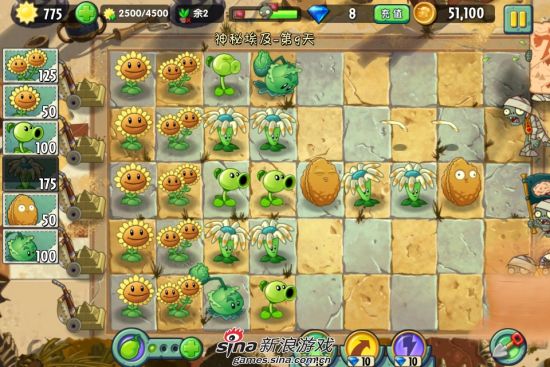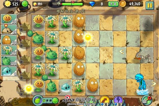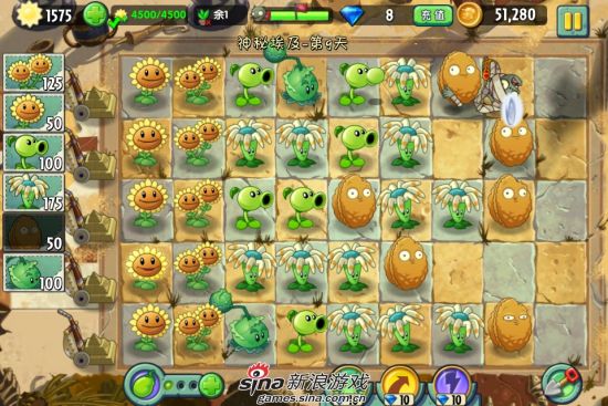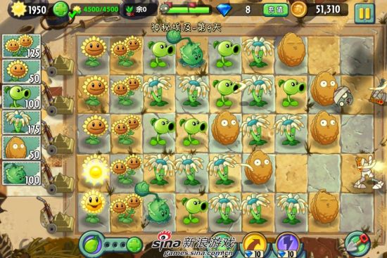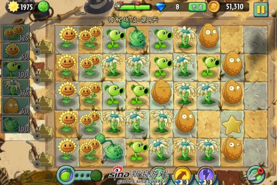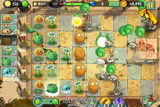 这一关的通关要求可以说是比较苛刻了,就这几种攻击植物,种满,坚果摆满,差不多就通关了,如果害怕阳光不满,可以使用能量豆给双胞向日葵加,一个能量豆能加225点阳光,如下图所示,有一点要强调的,向日葵必须要种两排,必须有一排是双胞向日葵,或者种两排双胞向日葵都可以,不然阳光点数肯定会达不成,任务就失败了,下面游戏截图给大家看一看吧。