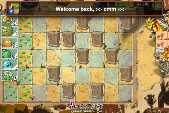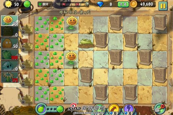 好了,不抱怨了,我们一起来打一下这关吧,这关可能让你兴奋,因为我们选择了一个前面几关用的比较少的植物——噬碑藤,那好吧,其实这个也没法让你更兴奋了,想一想,你仅凭这几个植物打通了很有难度的中国版,你会不会觉得自己比外国玩家牛?更有成就感(小编阿Q精神泛滥了!)