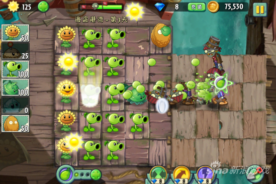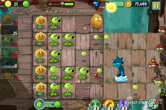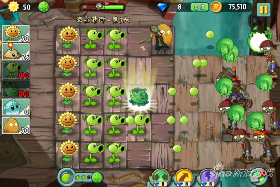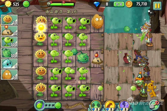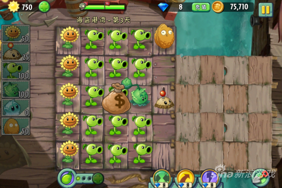 在海盗第三关中,大家可以按照常规办法来种植物,先种满一排向日葵,再种豌豆射手或者卷心菜,需要注意的是当出现海鸥僵尸的时候,还是建议大家用坚果来挡住,以防万一。