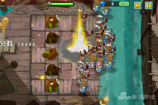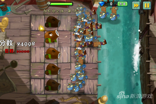 在植物大战僵尸2加农炮之战第一天中,我们需要达到3万分。