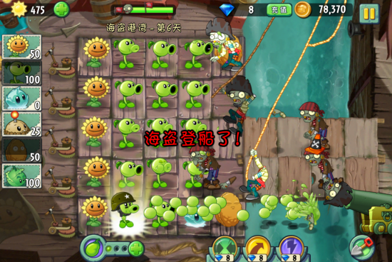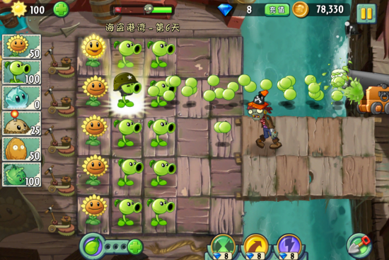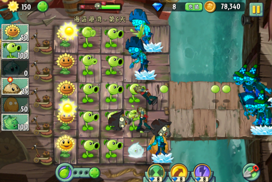 这一关的通关技巧就只有所有的能量豆都用来攻击有大炮的僵尸,比较难打的时候要用冰冻生菜冻住全场的僵尸。其他种满一排就开始种豌豆射手即可。