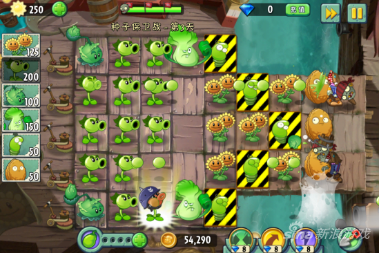 然后就要疯狂的种双胞向日葵了和豌豆射手了。在靠近岸边的植物种菜问,保护他们一下。他们才是最危险的!