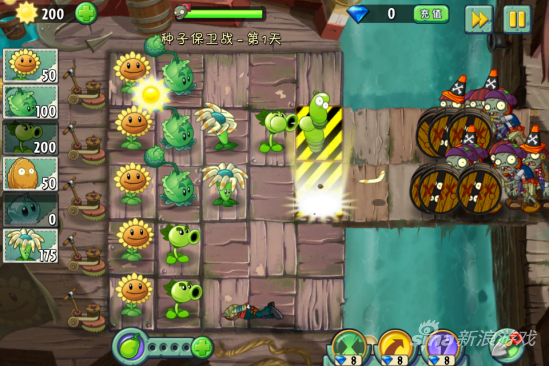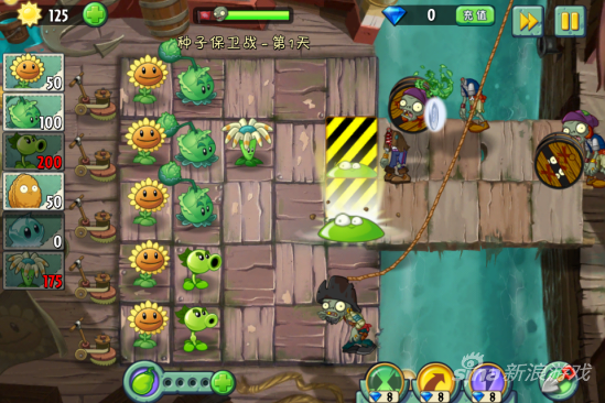 但是弹走僵尸之后需要几秒钟的缓冲时间才能恢复弹力,但是前几只僵尸来的都比较缓慢,所以我们完全有时间种好一排太阳花和植物啦,在这里我们要注意的是,我们的能量豆要怎么用,这里最好的方法当然是在一大波僵尸来的时候,把能量豆作用在弹簧豆身上,他就会把地面两侧靠近水边的僵尸都弹到水里,木桶僵尸也不怕啦!我们根本不用正面攻击他,他就自己死了!