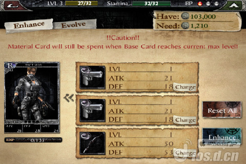 升级模式主要是强化你的卡片,选择你需要强化的卡片,再选择强化道具,强化道具也是卡片,所以一般没用卡片都可以拿来强化,再点击Enhance即可。
