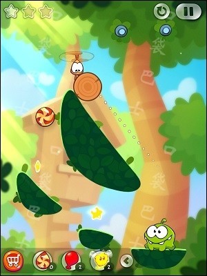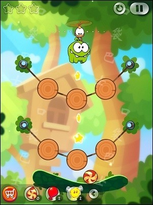 3.只要糖果越过了平台边缘,那么它就会下落,吃掉2颗星星,嘴中落入Om Nom的嘴中!