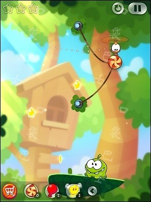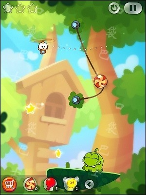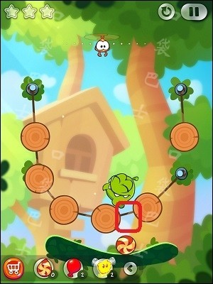 3.最后我们只要割断图中标识的绳子,Om Nom就可以开心的吃到糖果,顺利三星过关了!