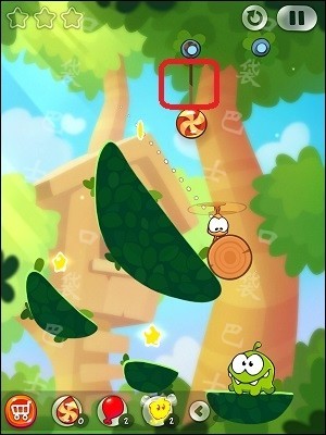 1.首先如下图位置,我们要在Roto到达星星上方时点掉它,让Om Nom吃掉第一颗星星。