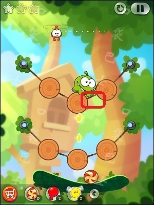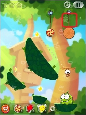 2.我们割断图中标识的绳子,Om Nom就会吃掉下方的2颗星星。