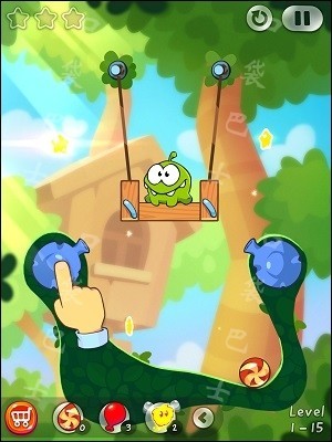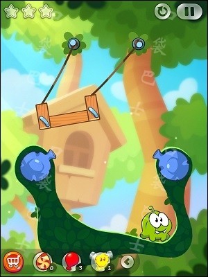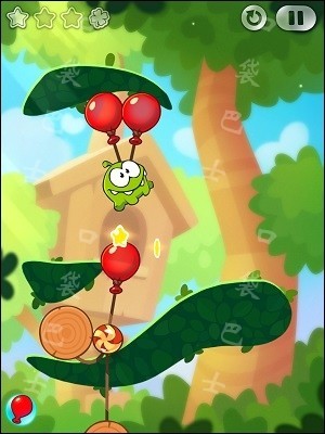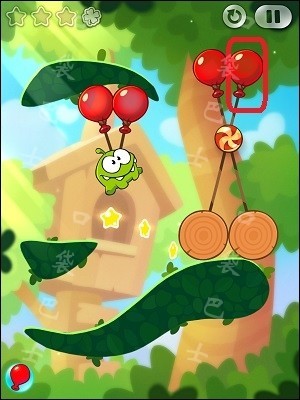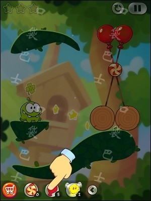 3.如下图所示,现在要做的很简单了,我们只要将所有的气球戳破,那么Om Nom就会吃到所有的星星和糖果!