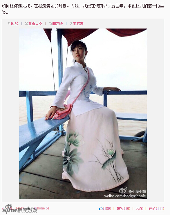 小孽,著名游戏声优,前上海Radio-Arts游戏电台明星主播,今年的上海CJ从无数Coser脱颖而出,获得宅男女神的称号。近日小孽在微博上发出“如何让你遇见我,在我最美丽的时刻。为这,我已在佛前求了五百年,求他让我们结一段尘缘”。网友纷纷称小孽书卷仙气迷人,更有人称“已定机票”。