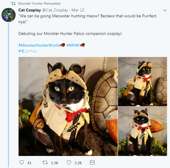 《怪物猎人:世界》官方推特日前为我们分享了一组随从猫的可爱Cosplay照,从照片来看随从猫的服装和道具很不错,如果猫再萌点就完美了。这组照片来自推特用户Cat Cosplay,博主也非常可爱,还用猫式英语为我们介绍:“我们将进入《怪物猎人》喵?因为那会很完美”