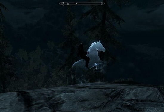 《天际》里面马匹很多,但是“魅影”是最出名的一匹。黑身赤目,正如其名,如夜晚的一瞥魅影一般幽暗而神秘,游走于峡谷城壕之间,有一种摄人心魄的惊悚之感。它的特性是惊人的回血速度,作为拉仇恨的肉盾实在是无出其右。获得方法是加入兄弟会,杀死国王婚礼上的公主,之后做掉护卫队长,这样,出兄弟会时外面黑色水池中就会暗流注涌般浮现这缕“魅影身姿”了。