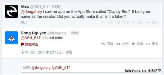 随后有用用户在Twitter上联系到了Flappy Bird的作者阮哈东,阮哈东表示这并不是他的作品,一切谜底都揭开了。(编辑:Alenvi)
