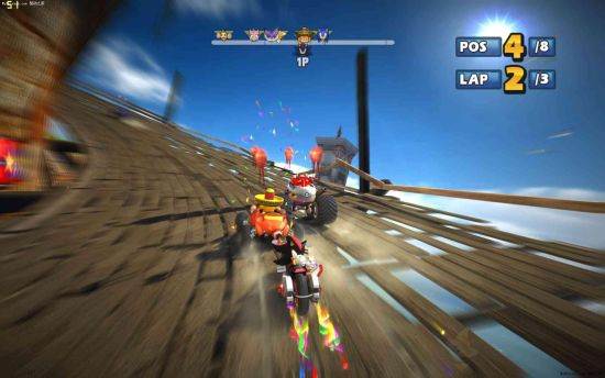 这种道具赛车游戏一般都是各种陷阱武器满天飞的,热闹又好玩,以恶搞为主。《索尼克全明星赛车》除了这些基本的东西,还可以对赛车进行变形,从汽车到气垫船到飞机!游戏甚至还有个终极赛车道具,用上它不仅可以轻松打败其他玩家,甚至直接把你送到第一名去!