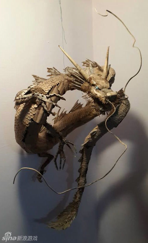 在他所有作品中,他最喜欢的是一只龙,这只龙也是他完成的第一个作品。他说:“我已经用纸板制作了很多作品。”比如,擎天柱、霸王龙和翼龙以及一整套的钢铁侠。最近完成的三个完全的真身大小。