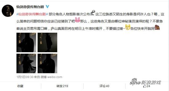 《仙剑奇侠传》舞台剧官方微博5日公布了三位主角的人物剪影图,那么这三位熟悉又陌生的身影是何许人也?官博表示,这么简单的问题相信大家应该已经猜到了吧那么,这些角色又是由哪位神秘演员演绎的呢?庐山真面目将6日上午准时揭开。