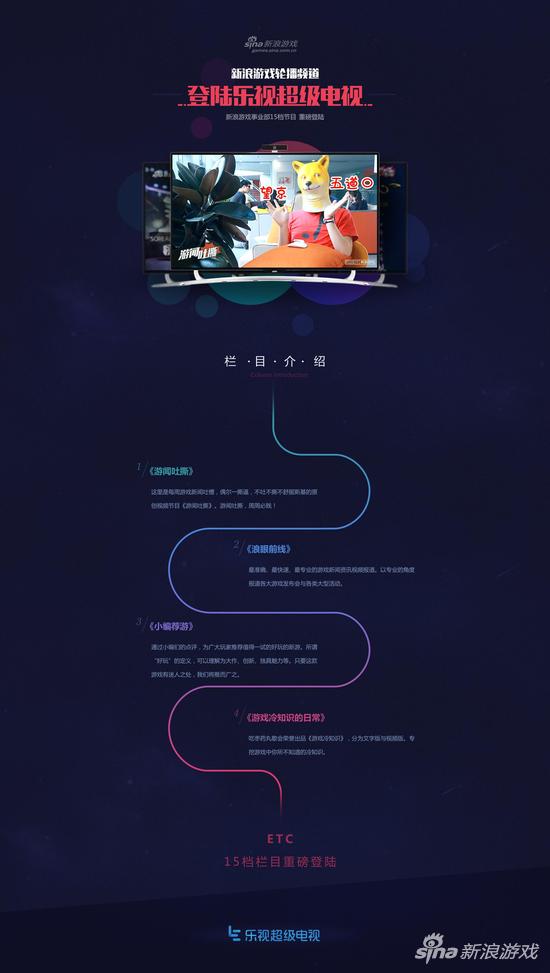 新浪游戏登陆乐视超级电视轮播频道乐视超级电视新浪游戏轮播频道是由新浪游戏与乐视联合打造的全新轮播台,频道编号为“游戏 272”,涵盖了新浪游戏频道下所有最具影响力、最为有趣的游戏视频栏目。频道内容包含游戏推荐吐槽、游戏评测、游戏新闻播报、明星游戏访谈等,集合时下最热门游戏为广大玩家展示最新鲜的游戏资讯。