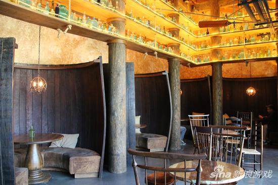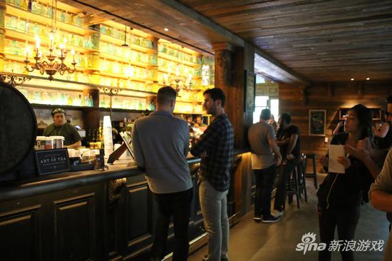 穿过庭院,一座“比尔吉沃特”酒吧出现在记者面前。面对酒吧里昏暗的灯光、木质的桌椅、堆积如山的朗姆酒瓶,顿时忘记身处游戏公司,仿佛进入了真正的海盗酒吧。