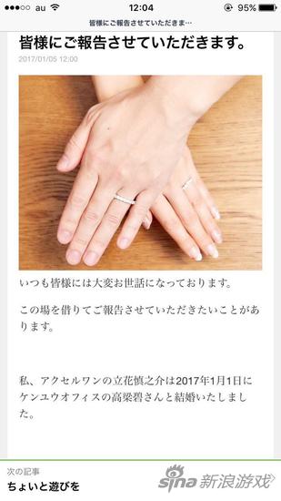 立花慎之介发博客称:“想要和好奇心旺盛,非常聪明又体贴的她一起发现更多这个世界的广阔、有趣、和至今未曾见过的新鲜事物。和我拥有共同价值观的她,对我的人生来说是不可或缺的存在。谢谢你让我遇到你。以后也会一起共同构筑属于两人的互相体贴,幸福明快的家庭。”