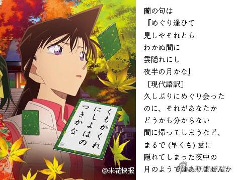 三人的歌牌都是从“百人一首”中摘取的,每首都对应有现在的番译。小兰的歌牌面是“めぐり逢ひて 見しやそれとも わかぬ間に 雲隠れにし 夜半の月かな”,现代的翻译为:好不容易与好久不见的你相遇了,却连你的样子都没看清就走了,你就如同那夜晚藏进云里的月亮一般啊。