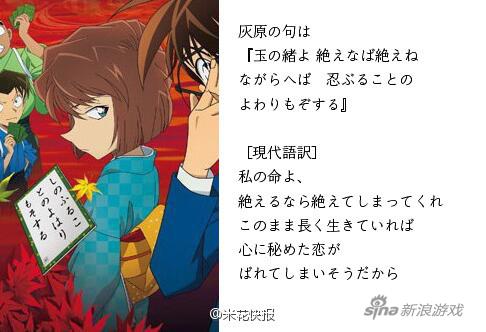而且灰原的歌牌则是“玉の緒よ 絶えなば絶えね ながらへば 忍ぶることの よわりもぞする”,现代的翻译为:我的生命啊,要失去就失去吧,再这样长久的活下去,我深藏在心中的恋情就要暴露了。看到这样样的话,真是让人有不太好的联想啊,本次也是首次提及到了小哀的恋情,不知道剧场版制作方要打算处理,但是怎么看都不会是好结果的感觉。