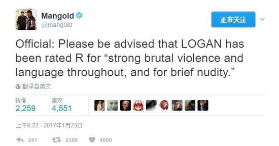 一直以R级片定位宣传的《金刚狼3》终于正式确认了影片的分级,导演James Mangold在推特上宣布:“《金刚狼3》的评级正式被评为R级,理由是电影中有极度残忍的暴力镜头和贯穿始终的脏话,以及短暂的裸露画面。”