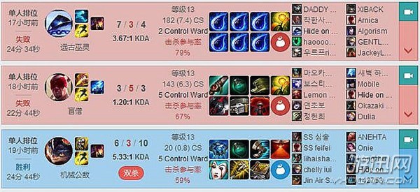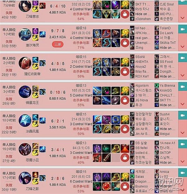 随后Faker更是迎来了一大波连跪,包括上图的两把,已经连跪了9把,掉了100多分。但是从下面战绩看,Faker都算很认真游戏,没有再出过6眼泪这种出装了。