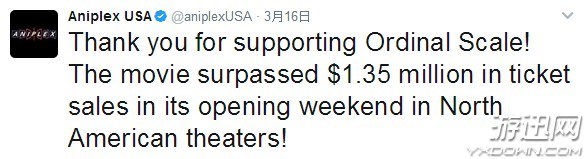 根据发行方Aniplex在北美地区的推特介绍,在上周《序列之争》剧场版开播后,当地观众们表现出极高的热情,观影人数逐日提升。在周末(3月11日、3月12日)的两天时间里,剧场版的票房直达135万美元,折合成日元为1亿3500万,成为外来动画电影在北美地区创造的崭新奇迹。