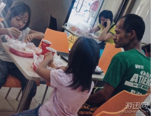 据了解,当时这名面容消瘦的父亲坐在位子上,默默看着两个女儿享用炸鸡,自己面前却什么也没有。Jhunnel Sarajan拍下这张照片后,立刻上前询问男子,并自掏腰包买了炸鸡请对方吃。