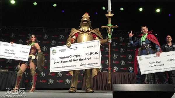 凭借这一套翁斯坦的COS装赢得了ECCC 2017大赛的冠军,并拿到了1500美元的奖金。从现场合影照来看,第二名是一位COS奇异博士的小哥,第三名则是COS神奇女侠的妹子。