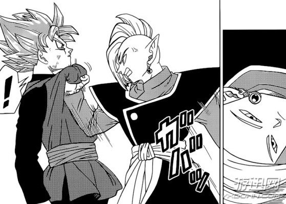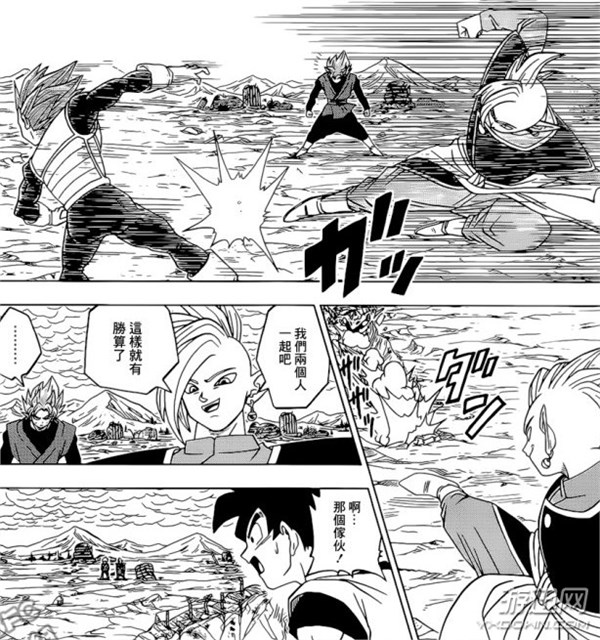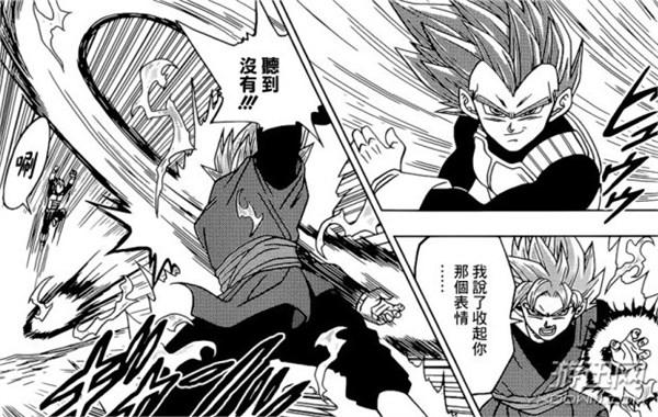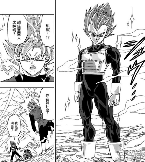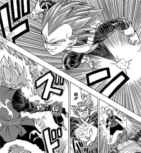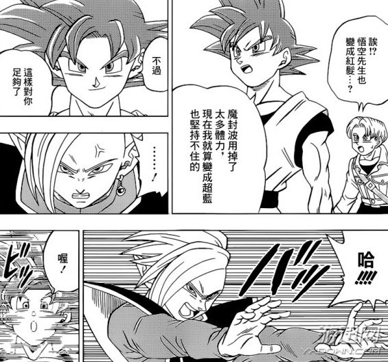在悟空贝吉塔赶到之后,他们迅速进行分工——其中悟空带着仙豆与小舞汇合,贝吉塔则变身超级赛亚人之神的红发与黑悟空继续开战。