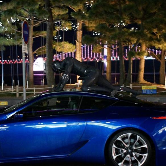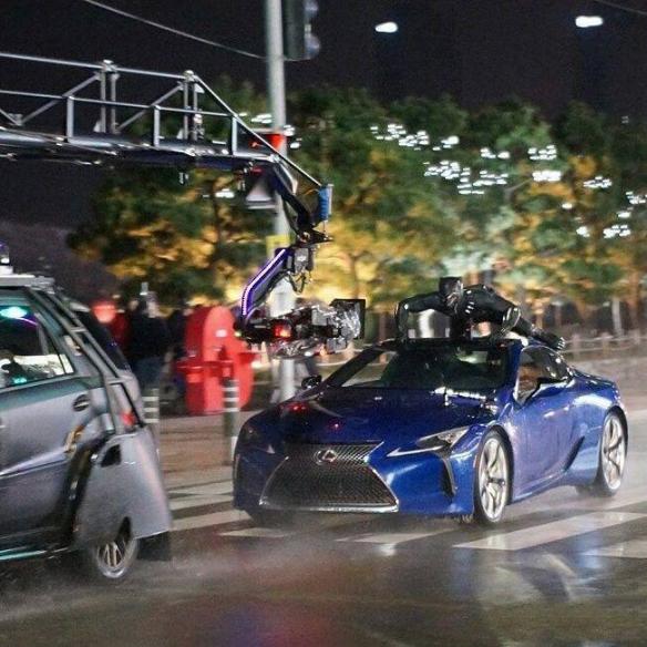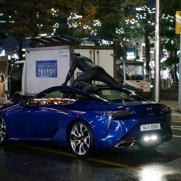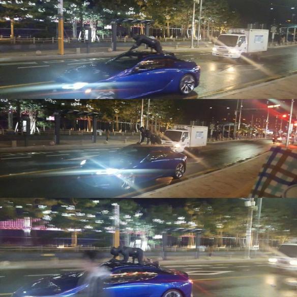 漫威电影《黑豹》日前正在韩国釜山取景热拍,今日首曝一组片场照,全副武装的黑豹伏在一部疾驰中的蓝色跑车车顶,场面惊险。