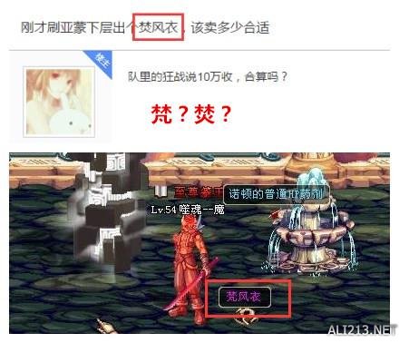在上古60年代,梵风衣是物理系PK利器,既加攻速又加移速,而且还加跳跃力。在各个大区,梵风衣都是可遇而不可求的极品。正因如此,我们经常能在聊天窗口看到收梵风衣的广告。不过喇叭里却经常写着某某玩家收“焚风衣”,焚表示的是着火的意思。总不能一件衣服都着火了,还穿在身上满大街溜达吧?