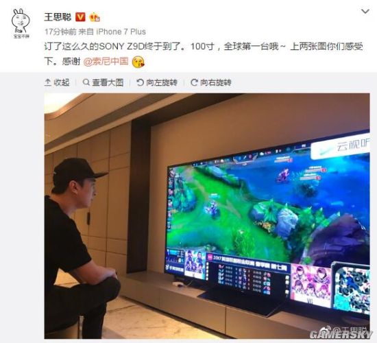 从图片上来看,100寸的索尼Z9D电视果然画质惊人,超大的屏幕想必也能给用户带来很强的视觉享受。王思聪则在微博上写道:“订了这么久的SONY Z9D终于到了。100寸,全球第一台哦~ 上两张图你们感受下。感谢 @索尼中国”。