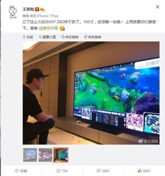 王思聪微博原文:“订了这么久的SONY Z9D终于到了。100寸,全球第一台哦~”